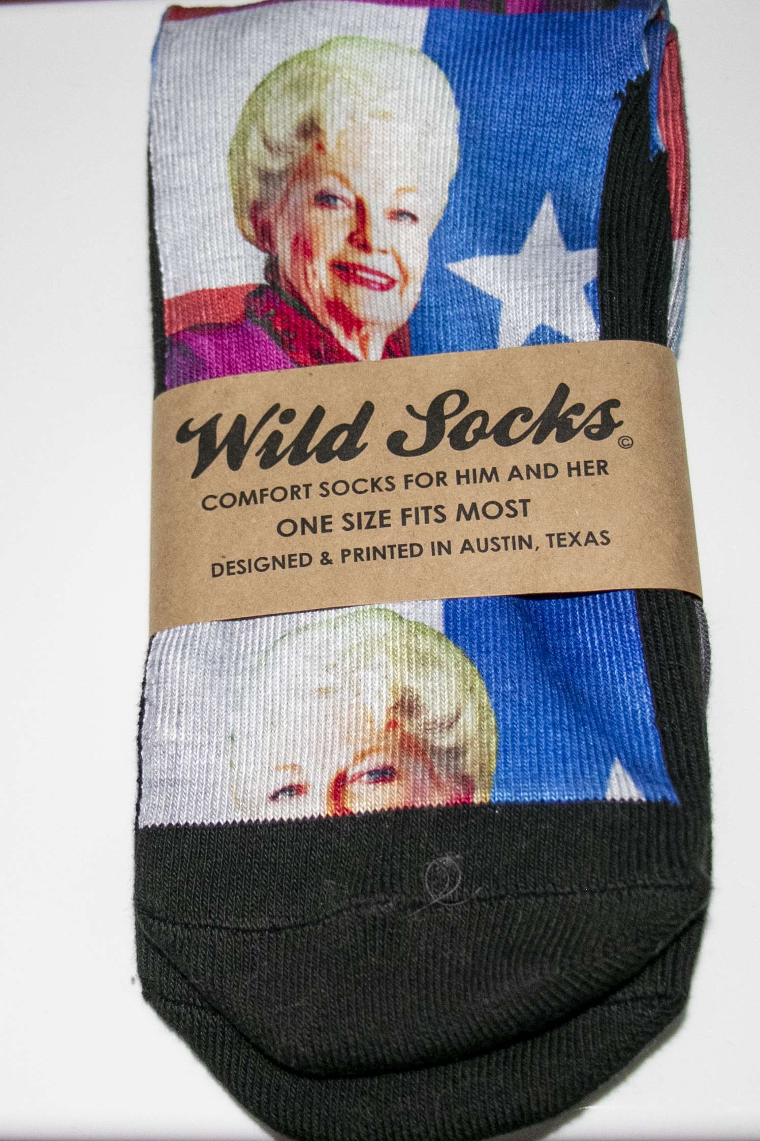 Legend meets Lone Star flair. This pair of black Wild Socks puts Governor Ann Richards in the foreground with the Texas flag waving behind—graphic, high‑contrast artwork that turns a daily essential into a conversation starter. Pull them on with boots or sneakers and let that unmistakable Richards spirit—sharp, confident, a little mischievous—walk with you.