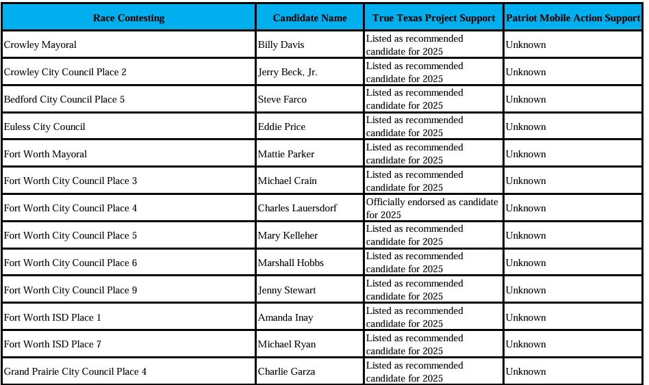 One purpose of the Tarrant County Democratic Party is to inform and empower voters. For that reason, I would like to highlight two right-wing extremist groups currently operating in Tarrant County who are actively engaging in the upcoming local elections. It is important for voters to be aware of the candidates these groups are supporting so they can make informed voting decisions. The two specific groups I am highlighting are Patriot Mobile Action and the True Texas Project.