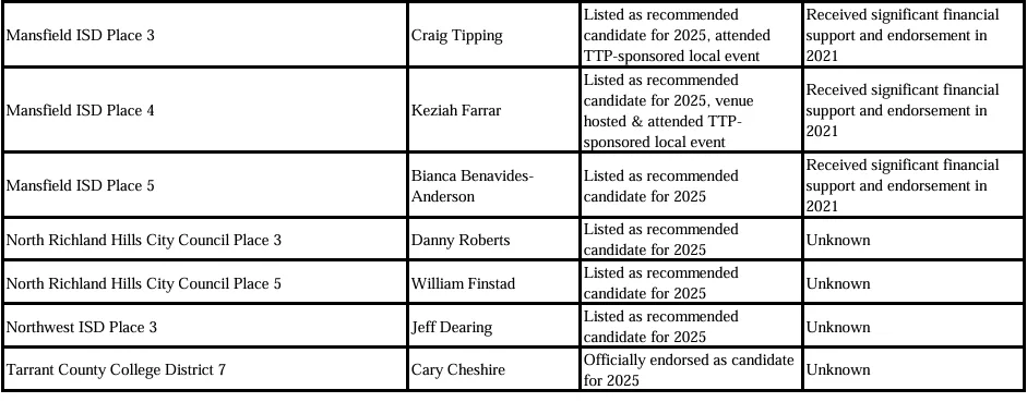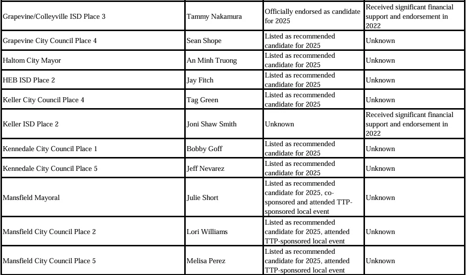 The True Texas Project is a right-wing group so extreme that the Southern Poverty Law Center included them on their national list of extremist groups. As reported by local press, TTP has hosted at least one conference in Tarrant County with panels discussing The Great Replacement Theory, a racist conspiracy theory that claims there is an ongoing plot to diminish the power of white people in society. The group includes on its website a list of “recommendations” for local Tarrant County races, as well as explicitly endorsed candidates. TTP also recently sponsored an election event in at least one local city where they invited select candidates to attend.